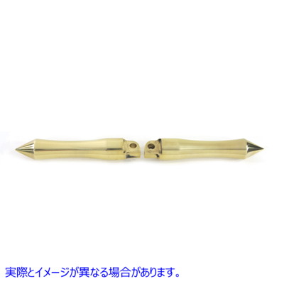 Male end mount footpeg set measures 6 inch in length with pointed ends. They are machined of solid brass and feature a polished finish. *NOTE: These will not fit passenger on 2018-up Softail models. Bolts available separately; V-Twin #37-0020 chrome bolt set and #37-1679 zinc bolt set.