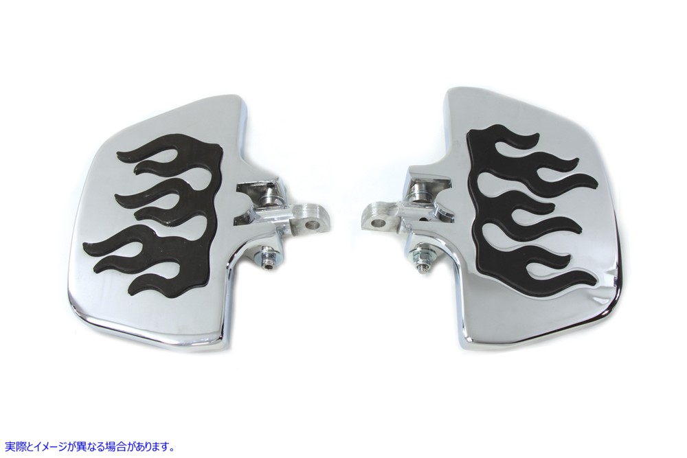 クロムミニフットボードセットは、ゴム製の炎のデザインテーパー側と調整可能なオスの取り付けクレビスを備えた非スリップ面を備えています。