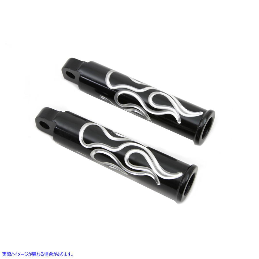 オスエンドマウントビレットフットペグセットは、黒い仕上げとハイライトされたボールミリングされた炎のデザインを備えています。