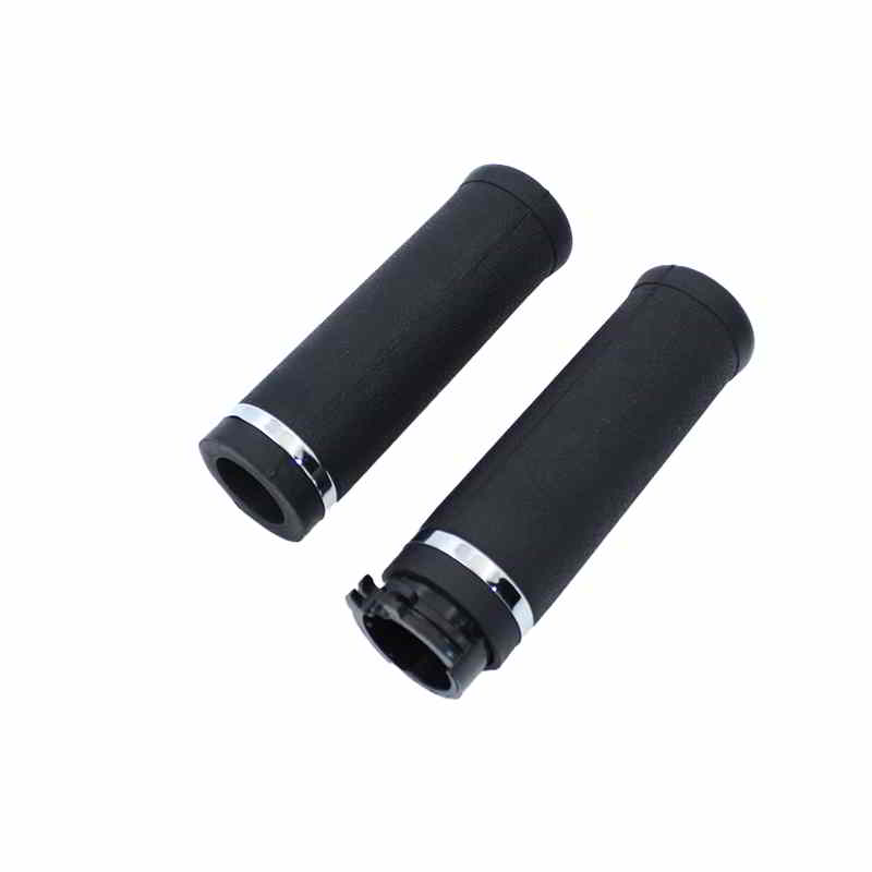 Handlebar black rubber grip set with chrome ends. Sold in a quanity of 2.