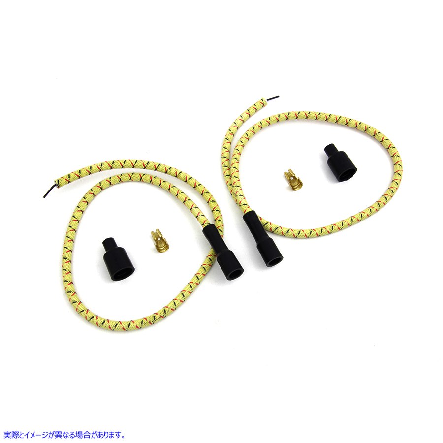Sumax spark plug wire set is yellow w/ black & red tracer. A combination Kevlar Helically Spiral Wound Core at 350 ohm per foot resistance delivers greater spark energy while improving power idle and fuel efficiency. Cloth jacket is rated at 450°F and resists heat oil and abrasion. These wires will work on all models with point or electronic ignitions. For use with universal sets with 90° boots. Set includes two 24 inch leads with black plug boots.