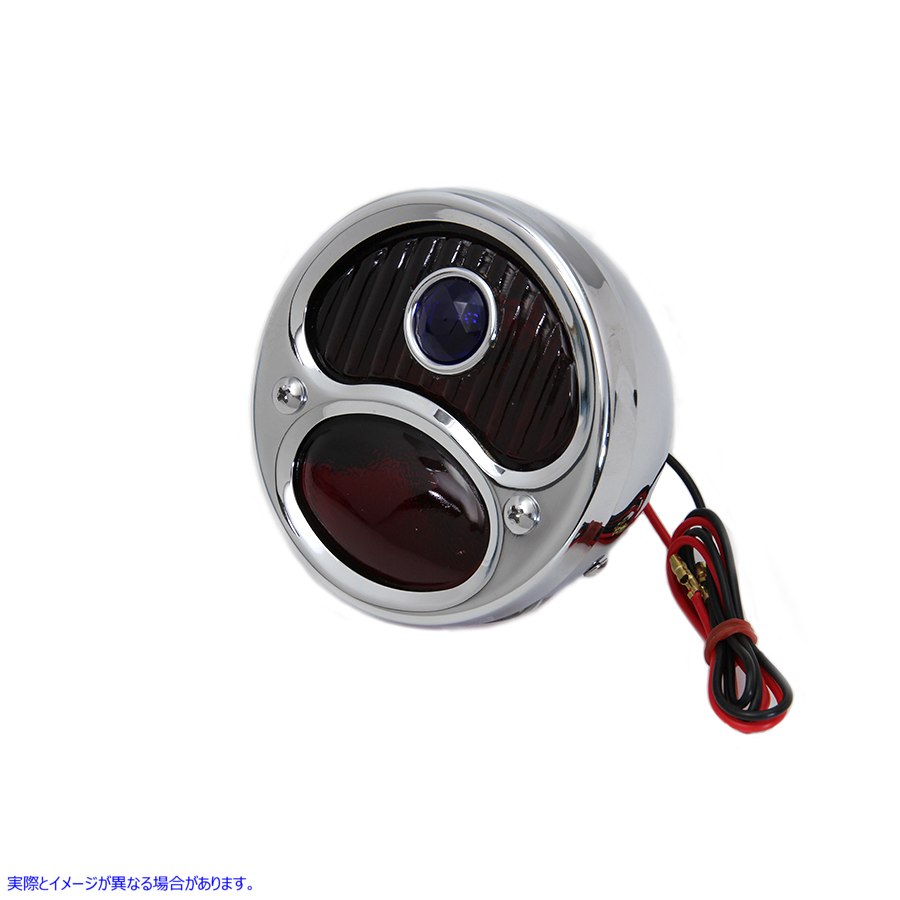 磨かれたステンレス鋼のボディと青いドットガラスレンズを備えた丸いテールランプ。