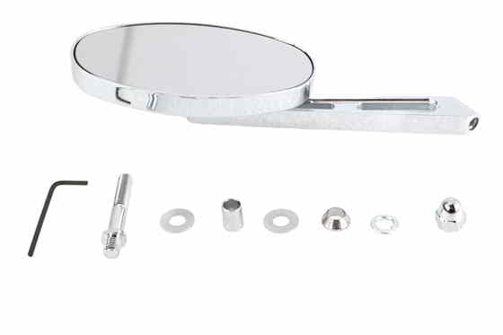 Chrome cateye style mirror with full smooth oval face has a girder style billet stem. Fits the left or right side.