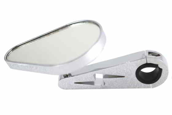 Chrome clamp on teardrop mirror with etched lightning bolt billet stem with 1 inch clamp and rubber insert. Use for left or right side.