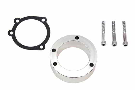 Air cleaner adapter features a plain machined finish and allows the installation and use of custom air cleaners on Delphi EFI injectors. Adapter acts as a clearance for the air cleaner. Does not fit 2008-2014 Dressers and Trike.