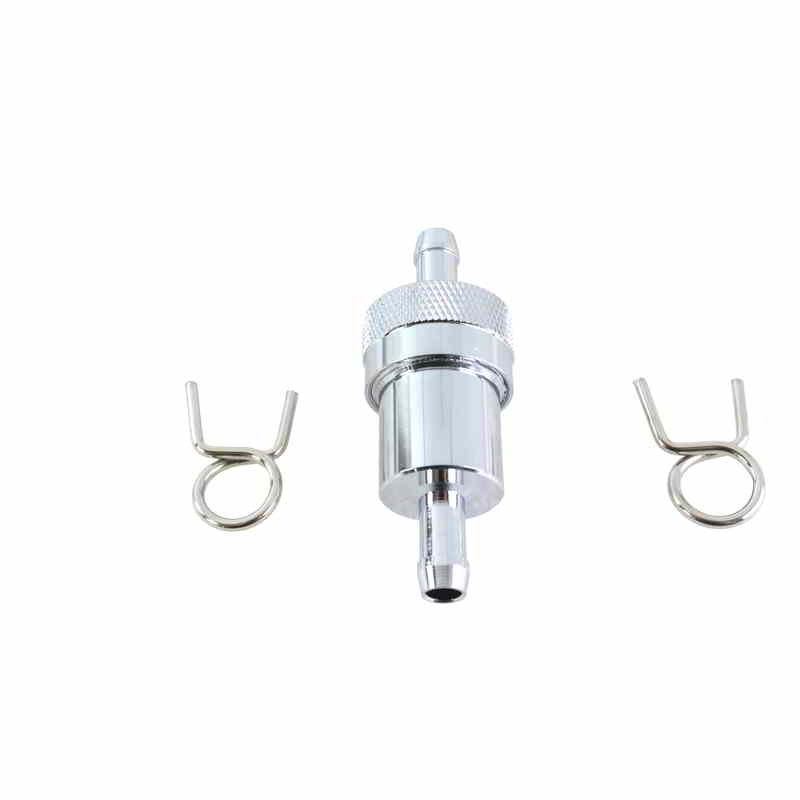 Chrome alloy fuel filter with replaceable brass basket filter. Features outstanding filtration with a high tech look and is 5/16 inch.