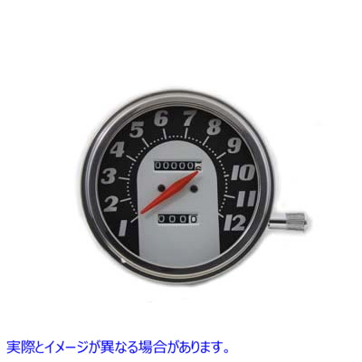 トゥームストーンスタイルの速度計の比率は1:1で、1~12 mph x 10と赤い針を読む銀の数字を持つ黒い背景を備えています。