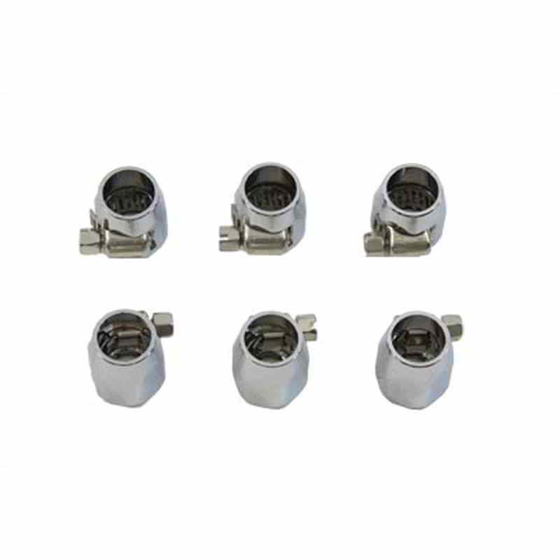 この1/4インチのヘックスエコノシールホースエンドは、ステンレスジャケットのゴムホースが切断されて取り付けられているときにクランプと仕上げ端として機能します。マイクロクランプは、クロム端の下に隠されています。