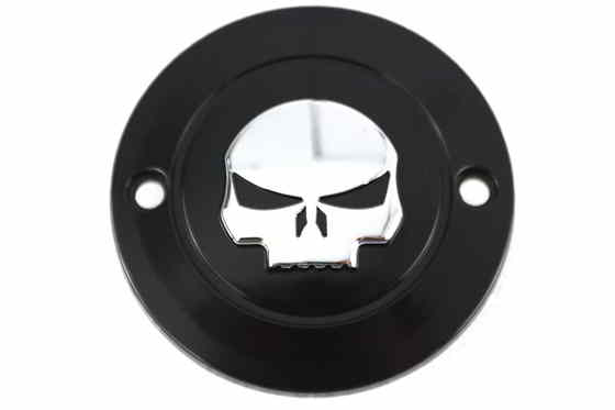Ignition points cover is the horizontal 2-hole style featuring a black finish with a skull design.