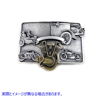 4つのオートバイとJDモーターが描かれたJDベルトバックル。銀色のピューターパティーナバックルに覆われたブロンズ色のモーター。