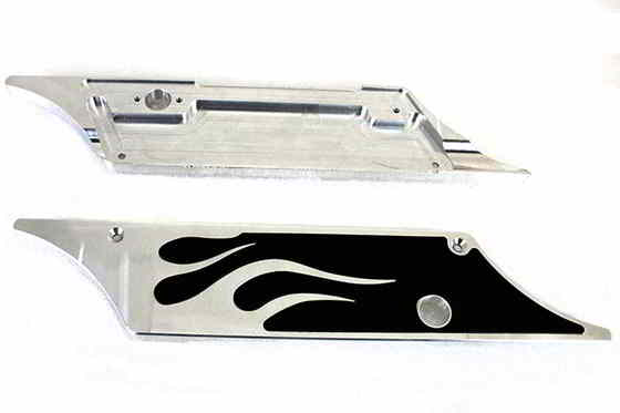 サドルバッグラッチカバーセットは、黒い炎のデザインインサートを備えたクロムフェイスプレートを特徴としています。