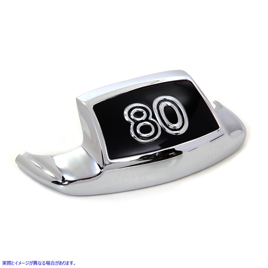 Die cast chrome front fender tip with the number 80 etched in the tip features a painted inlay. Fender is made from metal.