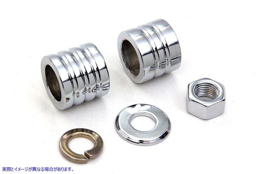 クロムフロントアクスルスペーサーキットはグルーブスタイルで、ワッシャーとナットが含まれています。