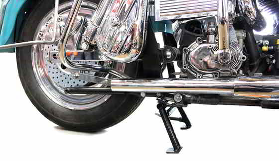 This black center stand bolts directly to the FL model frame. It lifts the bike upright and stands by activating the lever on the left side. In this position the bike looks great for display or servicing. **NOTE: Not for use as a ride off stand.