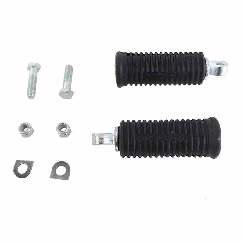 OE replica large black rubber footpeg set on zinc plated male footpegs. *NOTE: Does not fit the driver position on 2017-up XG750A 2007-2010 XL 883L 2007-up XL 883N 1200N 1200T 1200V and 1200X 2017-up XL 1200C 2016-up XL 1200CS 2018-up XL 1200NX and 1200XS 2008-2013 XR and 2008-2017 FXCWW FXCWC FXS FXSB FXSBSE FXSE and the drive and passnger position on 2018-up Softail models.