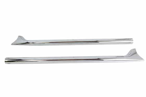 Factory Sample Chrome straight fishtail 42 inch extension set for universal applications has an outer diameter of 1-7/8 inch. Fishtail tips are welded on in place and are straight through without baffles. Fits over 1-3/4 inch outer diameter pipes. Order clamps separately. Suggested to use a smooth clamp to attach pipe extensions to drag or shotgun header pipes.Factory sample is a brand new production part but may have imperfections in the finished surface. Check threaded and bearing holes for excess plating before installation. There are no physical defects such as cracks or holes there will be cosmetic inpefection only.