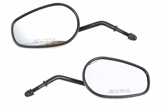 Black spear back rectangular Wyatt Gatling mirror set with short stock style stems. Set includes left and right side. Sold as a set of 2.