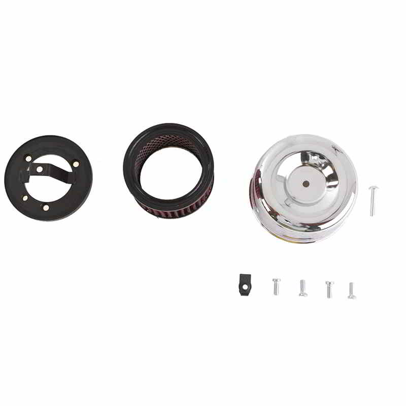 4-1/2 inch air cleaner includes a center screw louvered cover in a chrome finish backing plate and filter for CV carburetors and EFI units.